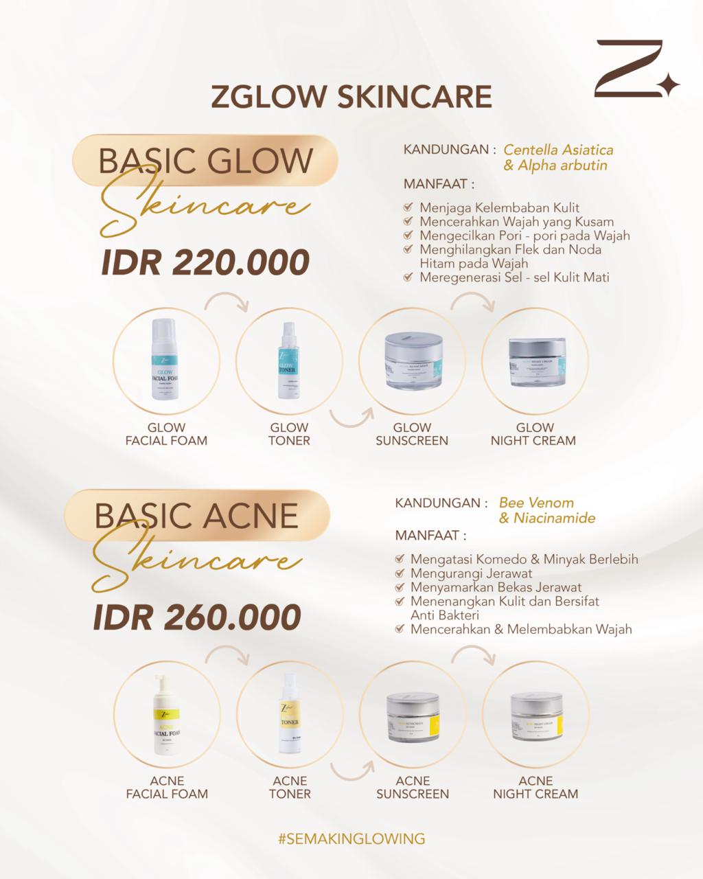 Glow facial foam, Glow toner, Glow sunscreen, Glow night cream, dan Free Pouch.